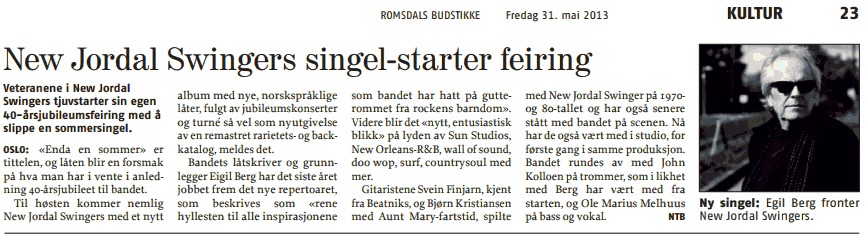 NTB melder om New Jordal Swingers sine musikkaktiviteter til høsten, og fem aviser har tatt saken: Drammens Tidende, Haugesund Avis, Romsdals Budstikke, Tønsberg Blad og Østlands-posten. ![]() ![]() ![]() ![]() Klikk her for å få en lesbar utgave av Romsdals Budstikke omtale nedenfor ![]() |