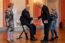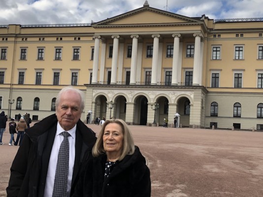 Eigil skriver: Fortsatt sterke minner, dette: Sammen med andre som hadde mottatt Kongens Fortjenstmedalje siste halvåret ble vi 28. oktober invitert til mottakelse på slottet der vi fikk takke kongen personlig. Slottsknekter tok oss vennlig imot, og først ble vi servert litt historikk om slottet og om de forskjellige salene vi fikk besøke før vi kom til Fugleværelset, der prominente gjester ankommer før de geleides inn til kongen. Så, kl. 14 går dørene opp til et eget rom, der kongen og dronningen venter på hver enkelt gjest. Og vi blir ropt inn ved navn, både medaljemottaker og ledsager. Så får vi hilse på kong Harald som rekker ut handa og gratulerer, og det blir dype bukk (se bildet) og takksigelser. Også overfor dronning Sonja. Tenke seg til ... Og vi blir geleidet inn i Speilsalen, der vi skulle innta lunsj med de kongelige, og vi får anvist plassene. Medaljemottakerne ved egne bord, ledsagerne ved andre bord. Og ... jeg kikker ned på bordkortet på den ledige plassen ved min side og ser at det der står H.M DRONNINGEN på kortet - jeg skal altså ha dronningen til bords ...
